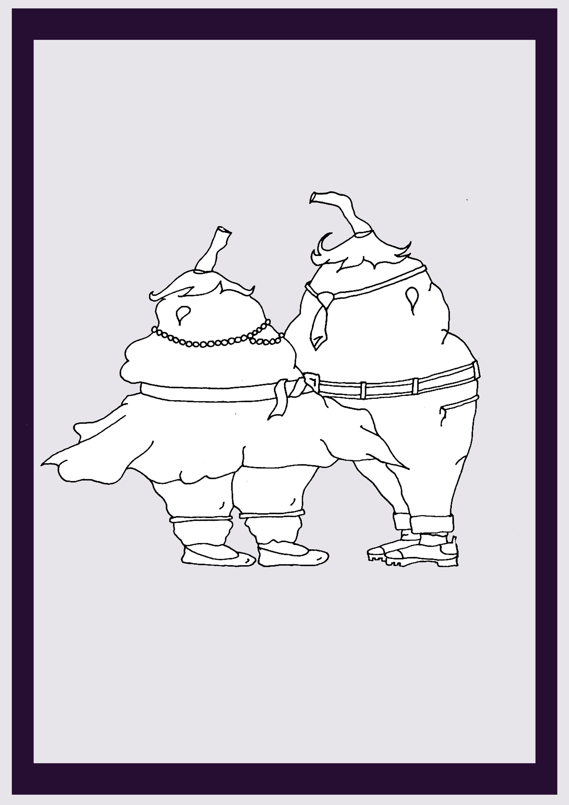HERR UND MS AUABERGINE. Drucken. Offene Ausgabe. Erste Zeichnungen des Künstlers. Digital verkleinert. (Ref.Og. SOR105V01. Erste Zeichnungen. Feder auf Papier)