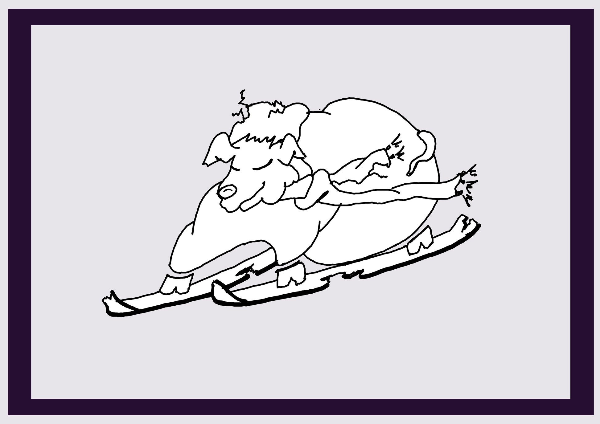 COCHON DE SKI. Imprimer. Édition ouverte. Premiers dessins de l'artiste. Redimensionné numériquement. (Réf.Og. SOR125V01. Premiers dessins. Stylo sur papier)